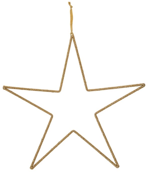 Place this gold Metal Beaded Hanging Star on your tree or on your wreath as part of your holiday decor. It measures 20x20 and adorned with glass beads with a cotton velvet ribbon.