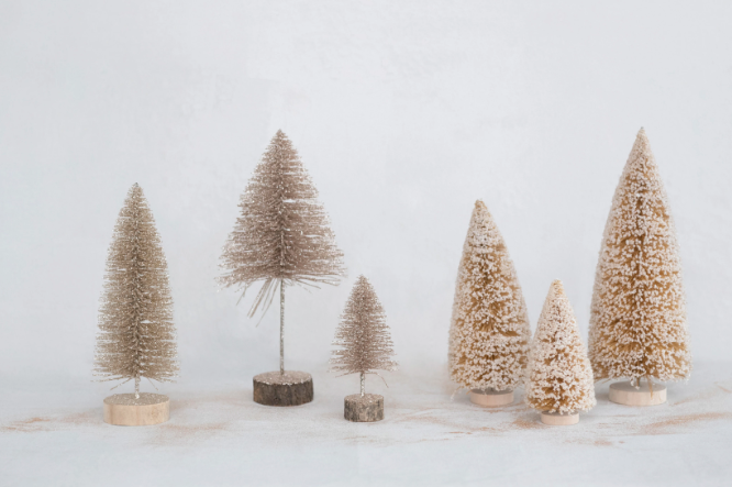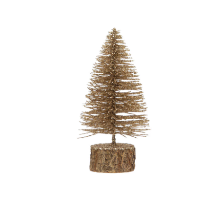 3" Round x 5-3/4"H Plastic Bottle Brush Tree with Glitter and Wood Slice Base, Champagne Color