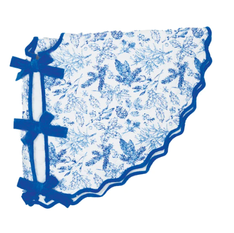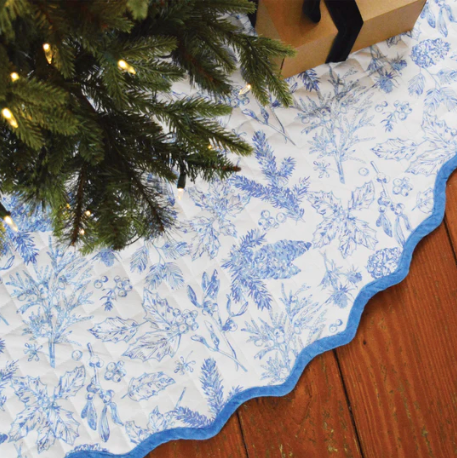 The quilted foliage tree skirt in blue is gorgeous and adds a touch of southern elegance to your Christmas Tree. The foliage design is intricately printed in blue and is made out of 100% pure cotton.