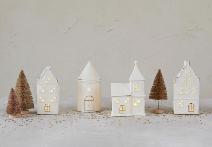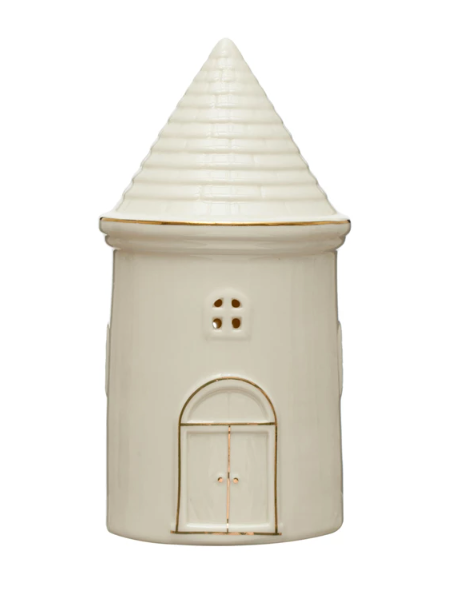 Stoneware House w/ LED Light & Gold Electroplating, White