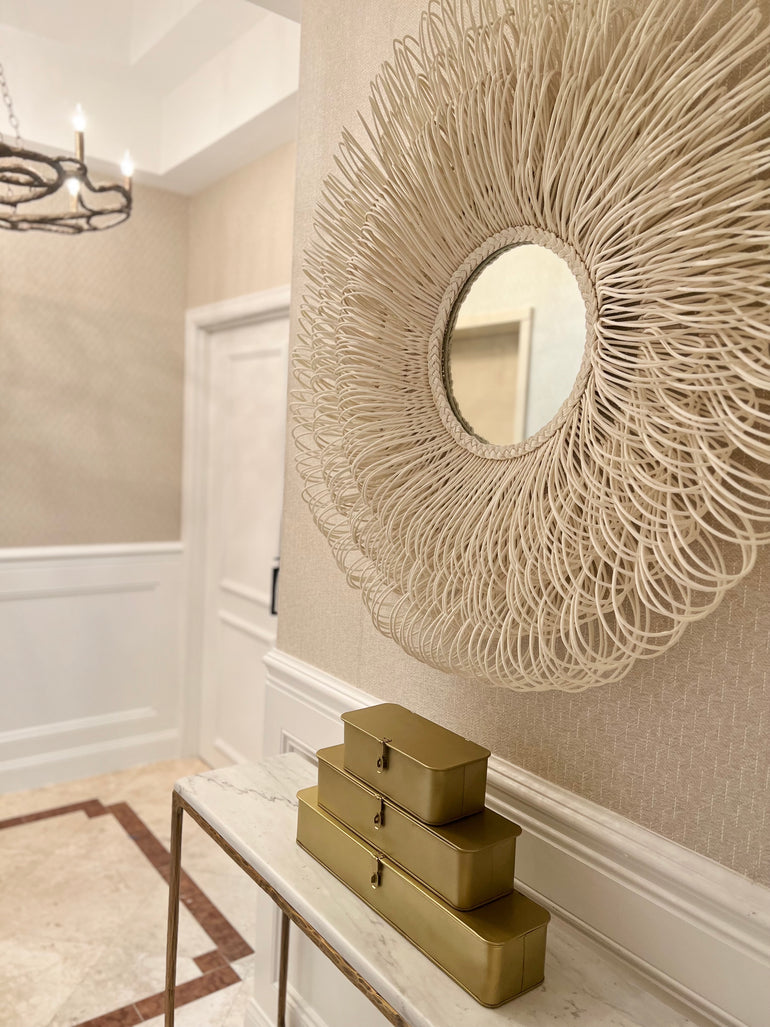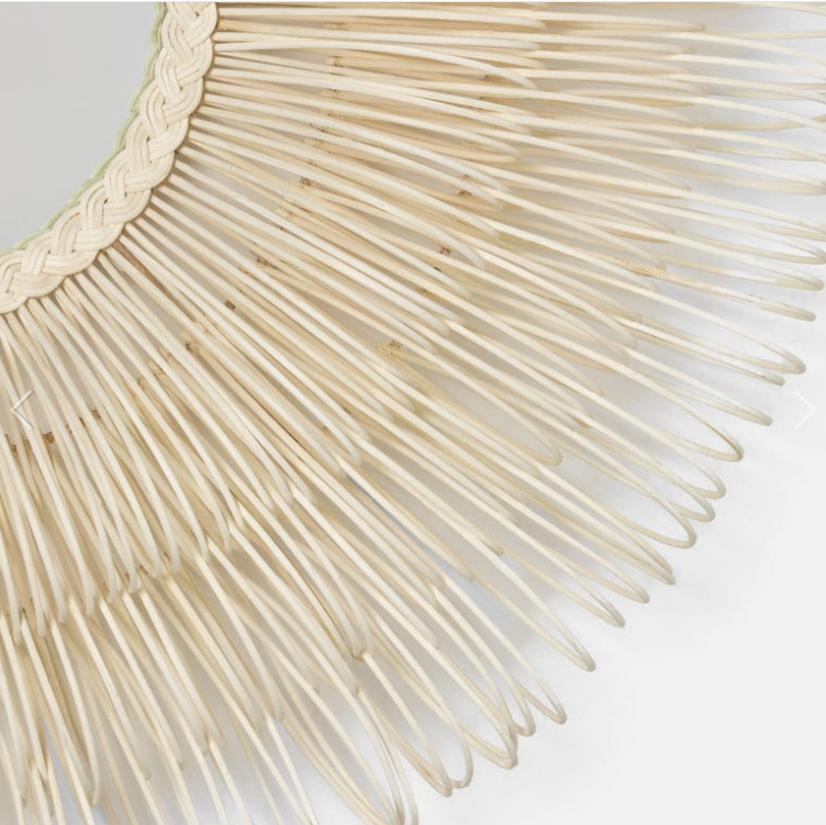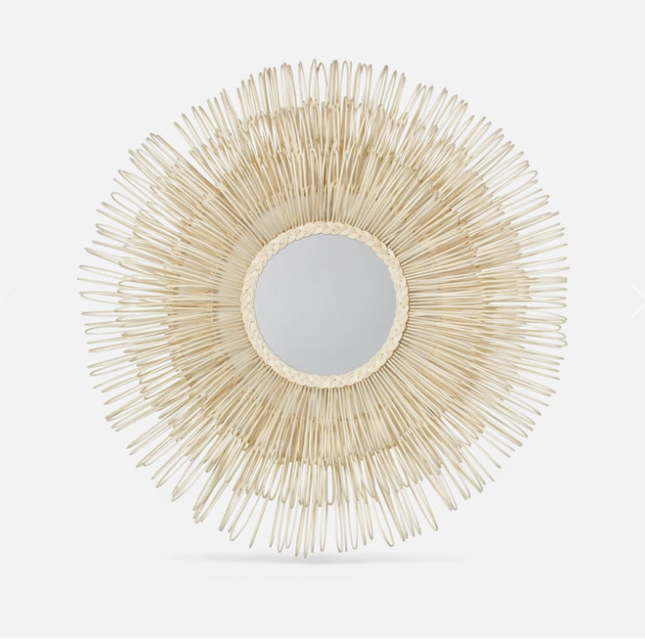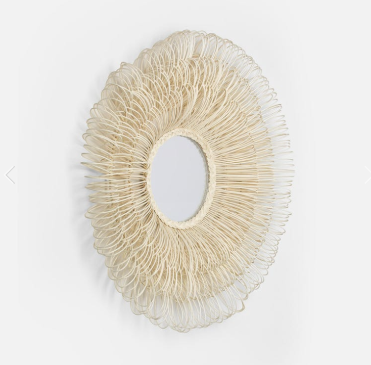Dense layers of hand-looped natural rattan surround a circular mirror. This mirror has arching loops forming a profile depth of approximately 7.25'' x 44 Diameter.