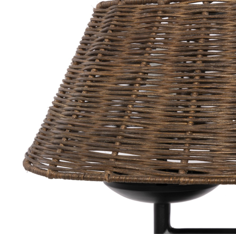 A Nancy Meyers Look! Warm up your space with our brown rattan shade table lamp. The black iron double arm base adds a traditional edge to set just the right mood.