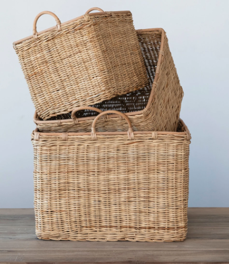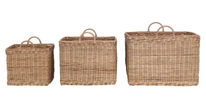 The woven baskets are perfect for homes with bohemian, coastal, or natural-inspired decor styles to bring a sense of warmth and organic beauty to any space. The baskets measure 20.5 inches square x 17.75 inches high, 18 inches square x 16 inches high, and 12.5 inches square x 13.75 inches high, making them a perfect set for any room.