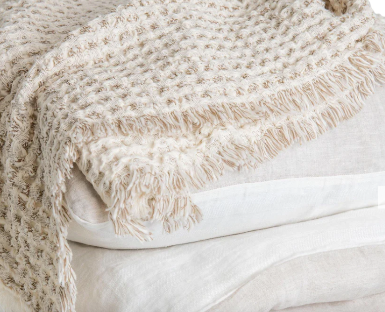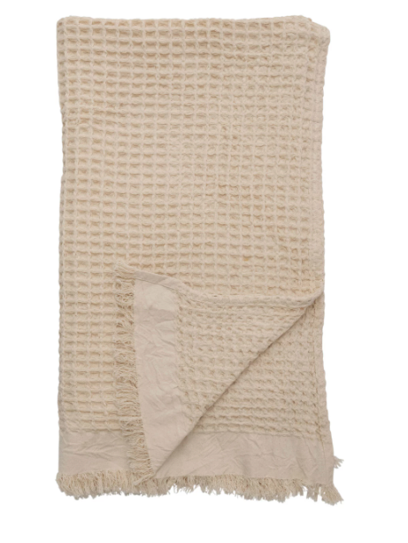 60"L x 50"W Cotton Waffle Weave Throw w/ Fringe, Natural color