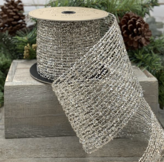 Description: 4" x 10yds metallic diamond stretch tinsel, platinum
