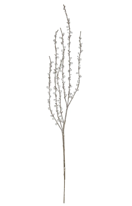 A dazzling and realistic faux twig spray with acrylic jewels and glitter and a champagne color. A perfect piece to add some glamour and sparkle to the home decor. Ideal for placing in a vase, basket, bouquet, or wreath.