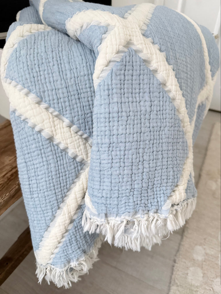 100% Turkish cotton trellis blanket designed to fit your king-size bed or to cozy on the couch, it offers a perfect blend of softness, breathability, and timeless charm.