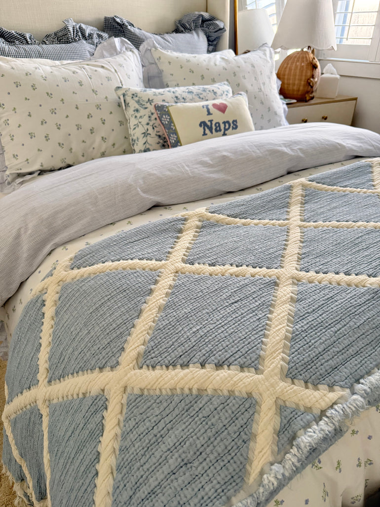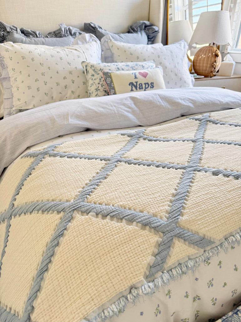 Reversible — cream/blue on one side and blue/cream on the other side making it easy to refresh your bedroom décor.